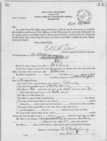 The residential developments of Del Ray and St. Elmo were established in 1894, and in early 1895, the United States Postal Service approved a proposal to open a St. Elmo Post Office in what is today Oakville triangle. When the Town of Potomac was formed, the Post Office was renamed Potomac Station. By the late 1920s, the post office had moved to a new building at the corner of Mt. Vernon and Del Ray Avenues (now The Dog Store). When the Town of Potomac was annexed into the City of Alexandria in 1930, the Potomac Station Post Office moved up the street to 2007-9 Mt. Vernon Ave (now Del Ray Picture Framing and Del Ray Balloon Boutique).