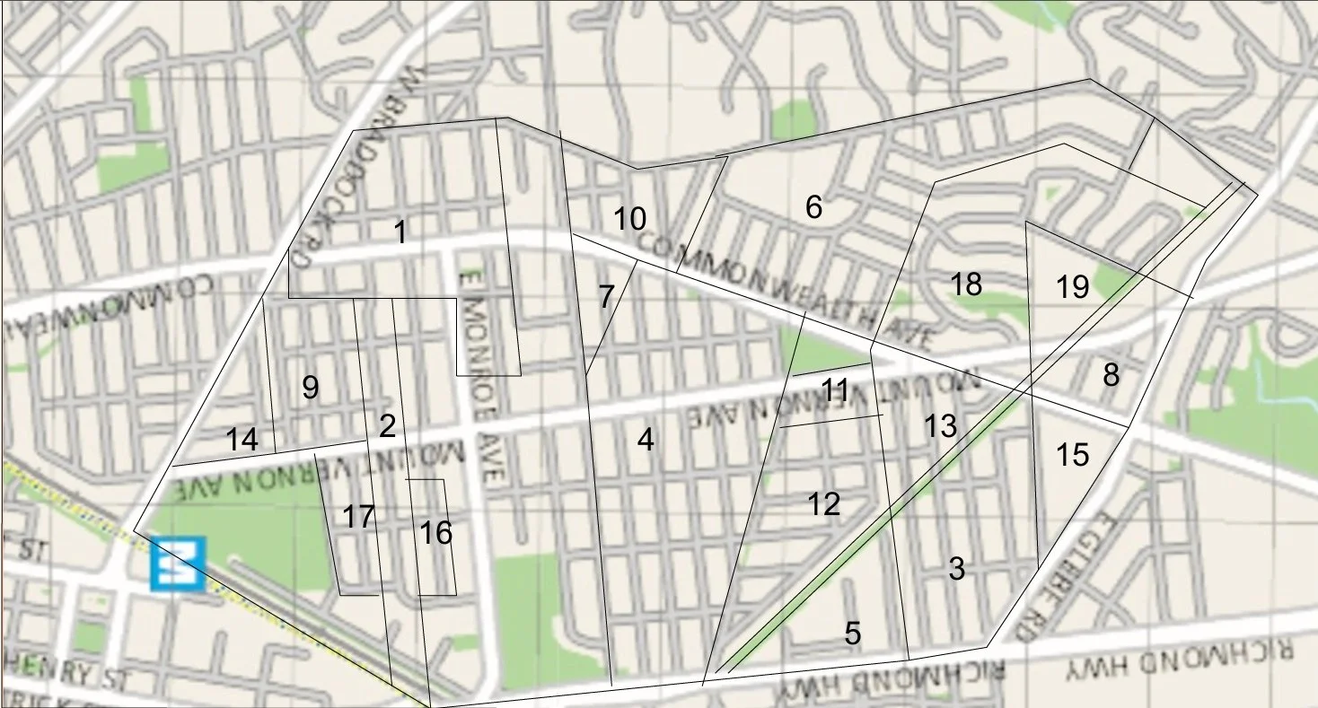 1 = Northwest Alexandria (1890); 2 = Park Addition (1892); 3 = St. Elmo (1894); 4 = Del Ray (1894); 5 = Oakville Triangle (1904); 6 = Mt. Ida (1908); 7 = Del Ray Section 2 (1911); 8 = St. Elmo Section 2 (1920); 9 = Brenton (1920); 10 = Rosecrest (1920); 11 = Mt. Vernon (1921); 12 = Abingdon (1922); 13 = Emma P Hume (1925); 14 = Temple Park Section 2 (1935); 15 = Auburn Village (1939); 16 = Linden Gardens (1939); 17 = Brenton Section 2 (1940); 18 = Warwick Village (1955); 19 = Calvert (1964)